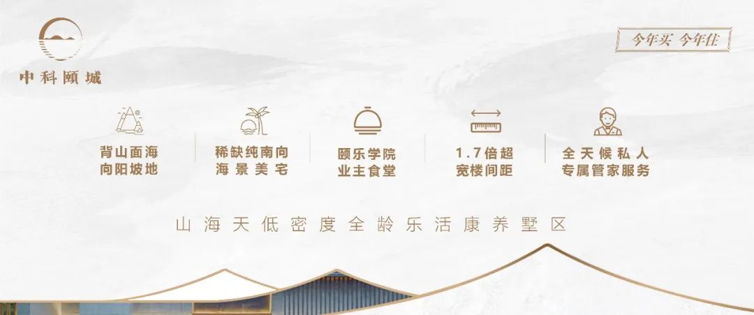 南向面海卧龙山下,山海天*旅游度假区里,有这样一个“一站式”康养住区——中科颐城。中科颐城,省、市重点“招商引资”项目,对标国际*“康养颐养”项目,规划南北两区,首推“共生宅”生活理念,打造与父母“一碗汤”的居住距离,既能拥有独立的生活空间,又能保证两代人共享社区精细化服务。