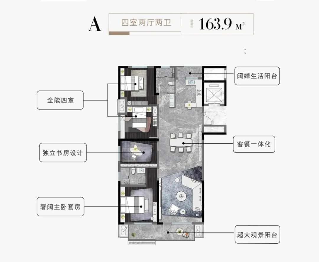 建面约163.9㎡四房两厅两卫户型,以一席全能宽境户型,用心拥抱美好生活。四个房间独立,动静分离,南北双向阳台,户型周正,南北通透。