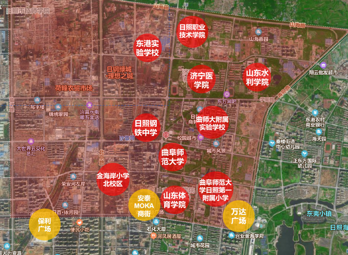 教育资源更是日照大学城片区的一张耀眼名片。大学城片区是日照市的科教高地,日照市高度重视“城市 + 大学”共同体建设, 片区内拥有曲阜师范大学、山东体育学院、济宁医学院、 山东外国语职业技术大学等7 所高校,此外还有曲阜师范大学日照第一附属小学、北京路中学北校区、金海岸小学北校区、日照钢铁中学等优质中小学,丰富的教育资源 不仅为周边增添了浓厚的学术氛围和更多的活力与消费力,也有力地支持了区域的高新技术产业和经济发展。