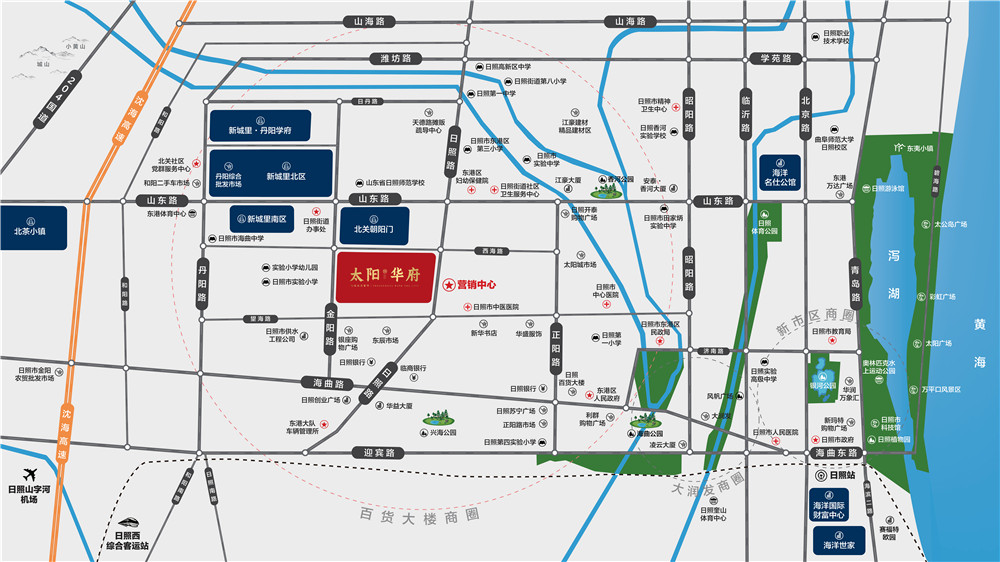 “三横两纵双高速”城市要道贯穿日照城区,承载了港城文化与繁华的主动脉。项目临近山东路、海曲路、迎宾路快速路三条东西向城市主干道,日照路、丹阳路南北向主干道,可通达日照繁华都市生活圈和醇熟配套。项目临近机场、西综合客运站、沈海高速、日兰高速口,同时公交线路众多,通达日照各区域,满足日常出行需求。