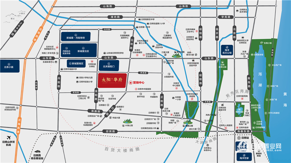 项目位于西城片区,多重业态汇聚,集吃喝玩乐购享于一体,商超、金融、酒店、通讯等业态配套完善。日照百货大楼、苏宁广场、日照银座购物广场等商超汇聚,太阳城市场、丹阳农贸市场等环伺周边,尽享便利生活。海曲印象文化广场、东港体育中心、万达影城、苏宁影城等休闲配套围绕周边,尽享生活繁华。