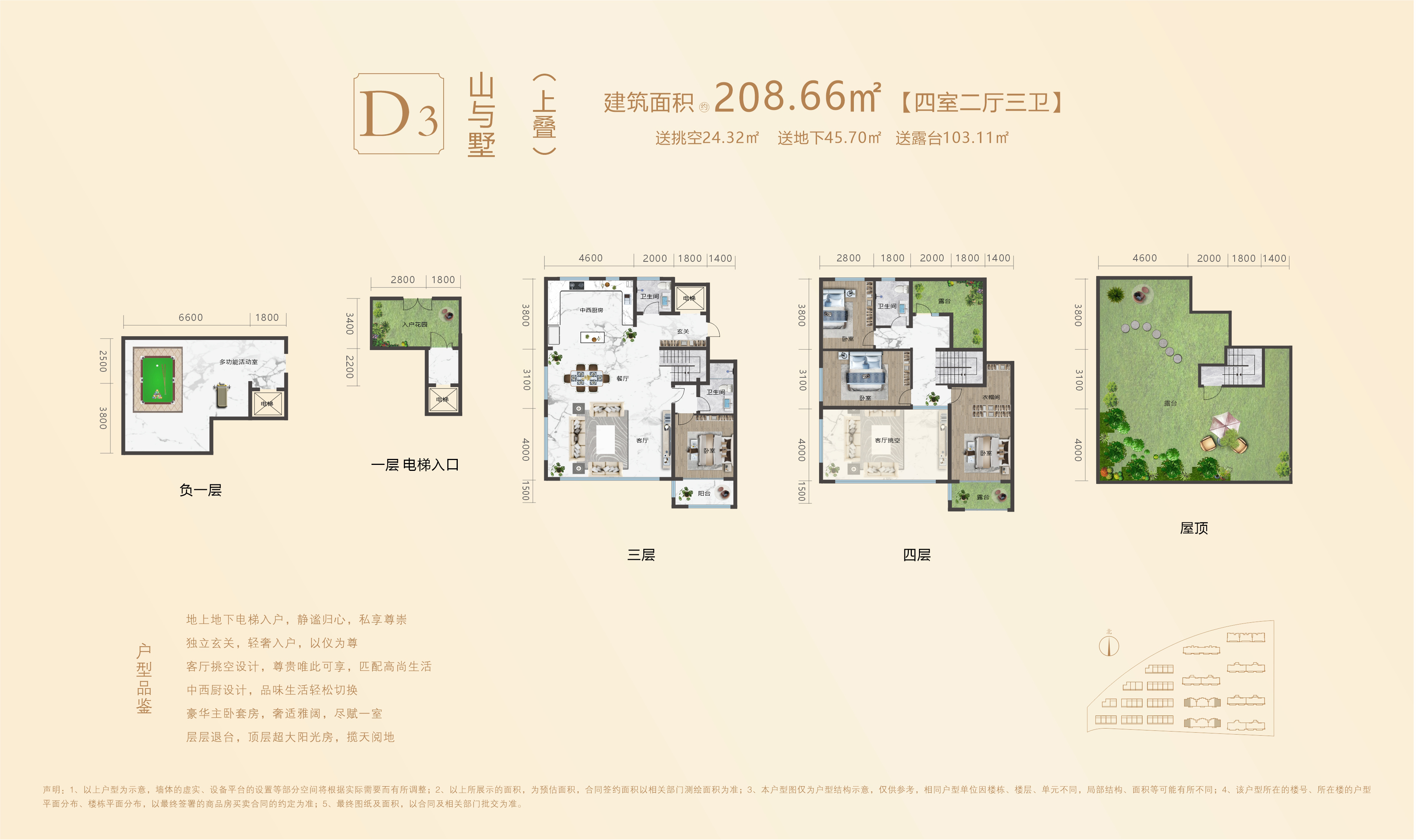 本期给大家介绍天宸华庭D3上叠户型,建面约208.66㎡,4室2厅3卫